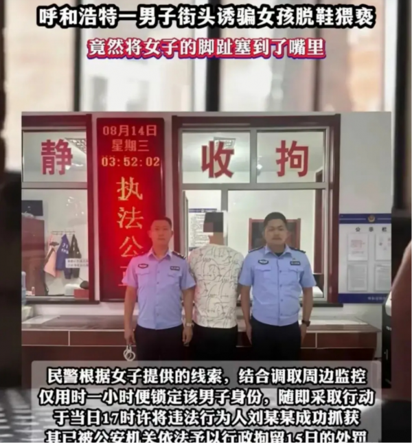 女孩依照其说法将鞋袜脱了准备检查时,斯文男接下来的行为让人大跌眼镜。斯文男首先抚摸女子的双脚,感觉不过瘾,竟直接将女子脚趾含在了嘴里。这样的操作着实吓坏了女子,女子立即报警,警方对该男子展开了调查,并做出刑拘15日的处罚。