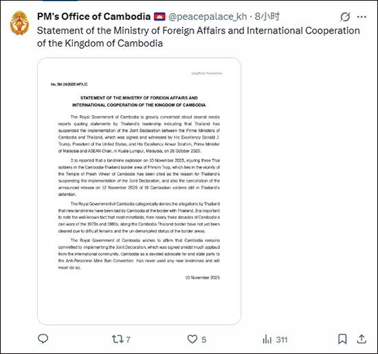 柬埔寨外交部重申,柬方将继续履行此前签署的《柬泰和平方针联合声明》中的各项承诺。目前,泰国方面尚未就此作出回应。