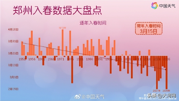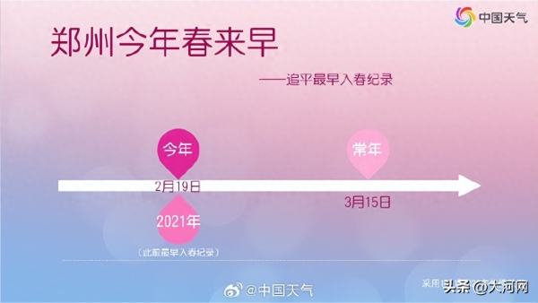 根据中央气象台发布:今年2月19日,郑州就已经正式跨过了"入春"的门槛。这比常年足足提前了24天,更是追平了2021年创下的历史最早纪录。