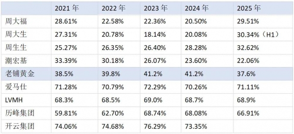 叠加成本采购、全直营等因素,老铺黄金的毛利率使其始终在40%左右,仅比传统金店的毛利率高出10%的水平。甚至在2025年金价上调的情况下,老铺还创下了五年来的毛利率新低37.6%。