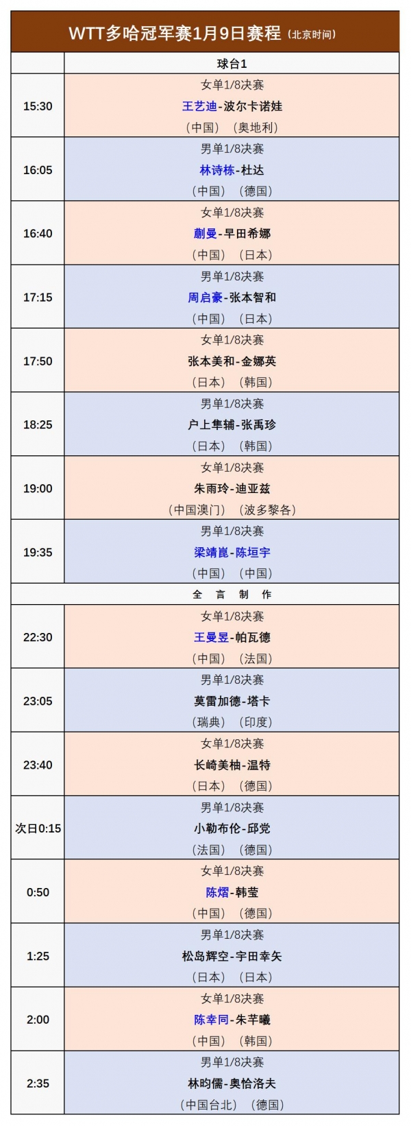 根据安排,国乒将在第三个比赛日迎来7场外战与1场内战,其中王艺迪在1月9日下午15:30率先亮相,对阵奥地利名将、两届欧锦赛单打冠军波尔卡诺娃,虽然王艺迪从未输过对方,但上次交手却差点败北,此战仍然有压力;紧接着16:05林诗栋将登场,与此前连续惨败不敌自己的德国主力杜达过招,竞技难度不大。