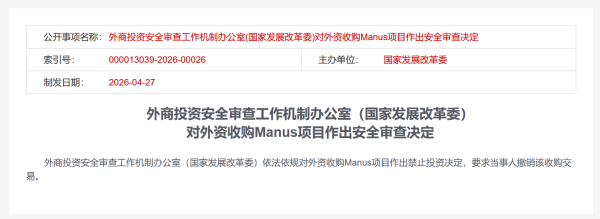 国家发展改革委:禁止外资收购Manus项目,要求撤销交易 2026-04-27 16:30 观察者网 国家发展改革委网站27日消息,外商投资安全审查工作机制办公室(国家发展改革委)依法依规对外资收购Manus项目作出禁止投资决定,要求当事人撤销该收购交易。
