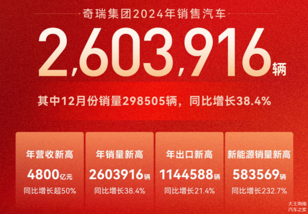 2024年,奇瑞集团销量达到历史性的260.39万辆,创历史新高,同比大幅增长38.4%,新能源汽车2024年销量超58万辆,同比增长232.7%,海外出口超114万辆,同比增长21.4%。