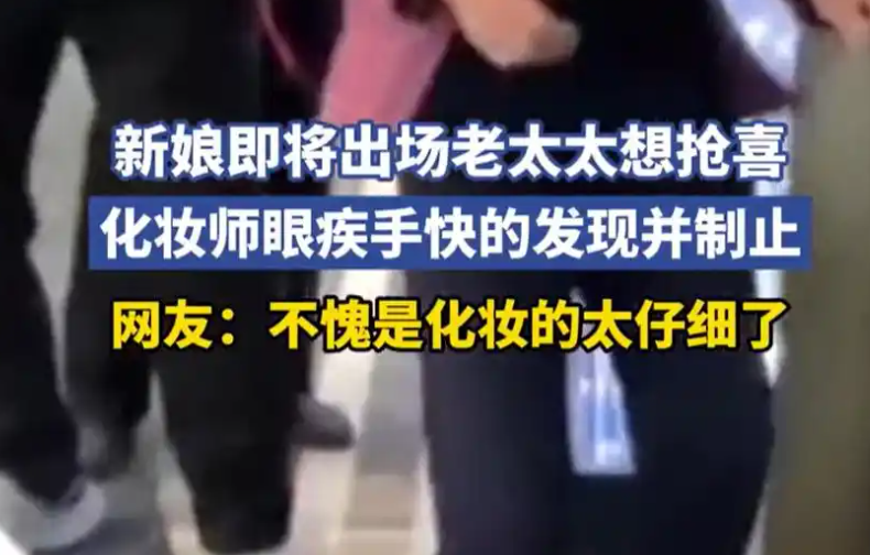 新娘准备出场时老太太想要抢喜,被化妆师一把拽回制止