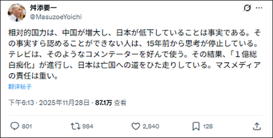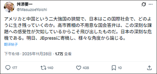 接着,他又在后续的帖子中写道:"在美中这两个大国的夹缝中,日本应当如何在国际社会中生存下去?高市在国会中的不慎答辩,正是因为对这一深刻课题完全缺乏敏感性才会说出口的。这是日本面临的严重危机。"