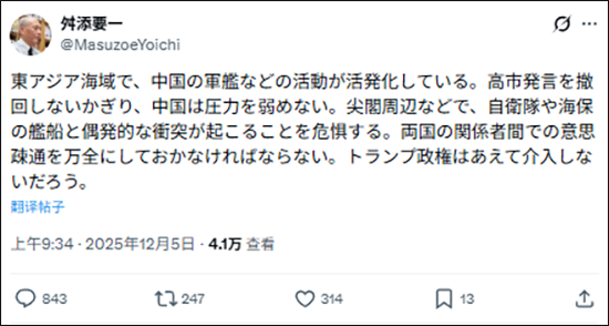 舛添要一指出,"连日来中国军舰及其海警船只在东亚海域的活动愈加频繁。如果高市早苗坚持不调整立场,中国不会因此降低施压力度。"他非常担忧地强调,日本民众已经开始担心钓鱼岛周边可能会发生涉及中日两国的意外武力冲突。