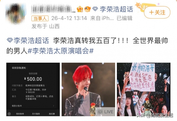 2026年4月12日,李荣浩在太原演唱会现场的一个举动,让他瞬间成为全网焦点--他竟真给一位举牌互动的粉丝转账500元,还附上签名,这一操作实在太"豪横"!
