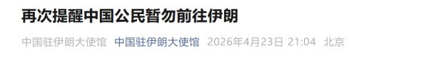 23日晚,中国驻伊朗大使馆发布消息,当前伊朗开放部分空域,但地区局势仍存在很大不确定性,伊朗安全形势依然复杂多变。外交部已提醒中国公民暂勿前往伊朗,中国驻伊朗使领馆再次提醒中国公民严格遵守相关安全提醒,已在当地的中国公民加强安全防范,避免前往军政部门等敏感区域,并尽快通过适当方式撤离,或前往相对安全地区避险。如遇紧急情况,请及时报警并向中国驻伊朗使领馆寻求协助。