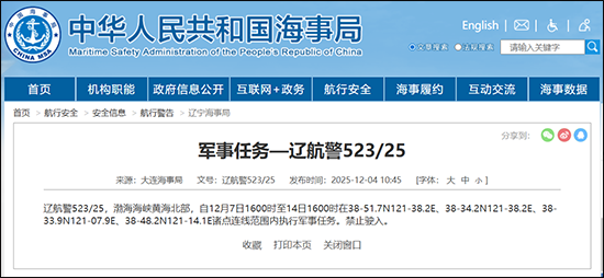 航行警告:渤海海峡黄海北部执行军事任务,禁止驶入 2025-12-06 11:00 观察者网 中国海事局网站消息,大连海事局发布航行警告,12月7日16时至14日16时,渤海海峡黄海北部部分海域执行军事任务,禁止驶入。