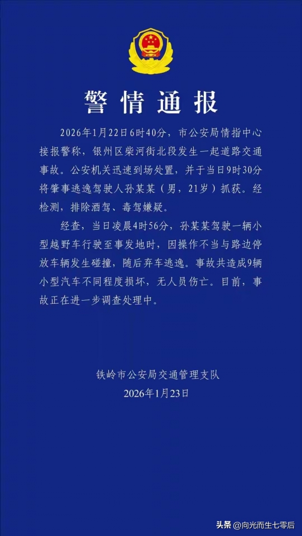 2026年1月23日,铁岭市公安局交通管理支队发布警情通报称,昨日凌晨撞毁多车后逃逸的男子孙某某于当日就被抓获。