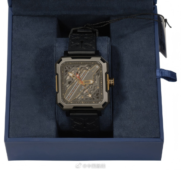 包括大家在网上都关注到的那只手表,今天我也带来了。这个图案是福建舰,它的秒针最大特点是一个舰载机,然后下面跟着一个红星。跟红星的融合体现出中国人民海军忠于党,践行万里共一航。这个表的设计非常有意义,拿到这块手表,很多网友开玩笑说这是一个让全网破防的国家级回礼。