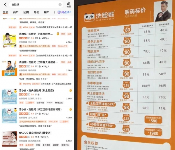 以洗脸熊为代表的洗脸吧是近几年流行起来的轻美容业态。与传统美容项目不同,洗脸吧服务项目大多比较基础如清洁、补水等,客单价普遍在一两百元,基础套餐的新客体验价甚至低至40-60元。消费复苏和美业竞争白热化背景下,提供低价基础服务的洗脸吧以其差异化定位迅速扩张。目前,赛道内目前已跑出洗脸熊、洗脸猫、洁小白、元气兽等连锁品牌。