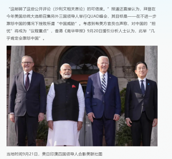 9月20日,美国、日本、印度、澳大利亚四方安全峰会在美国举行。在举行前,美国就已经发表了声明,沙利文也站出来说,"峰会的宣言不会针对其他国家,内容主要是全世界范围内的。"