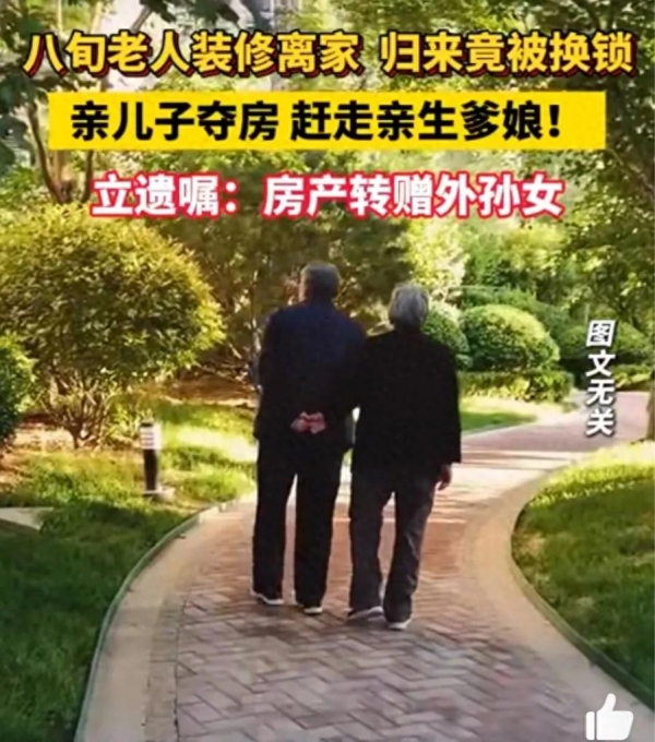 外孙女黄女士在两位老人的陪伴下成长。两位老人意识到靠儿子无法养老,于是决定立遗嘱,将房屋遗赠给外孙女,并由她负责照顾他们的晚年生活。