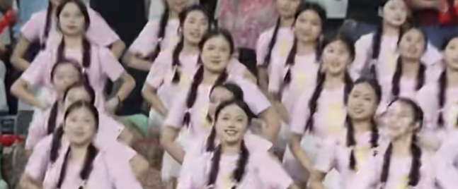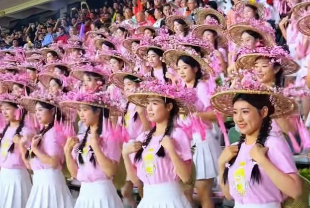 梅州粉丝拉拉队由近百个客家姑娘组成,着粉白服饰,统一麻花辫和流苏斗笠造型。