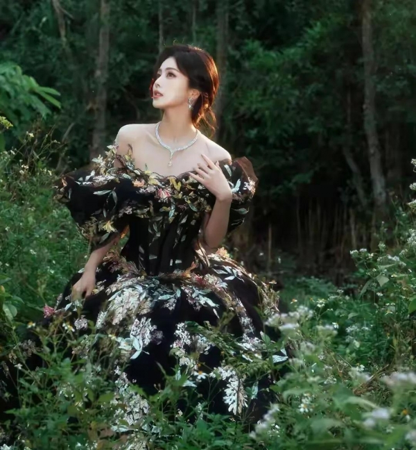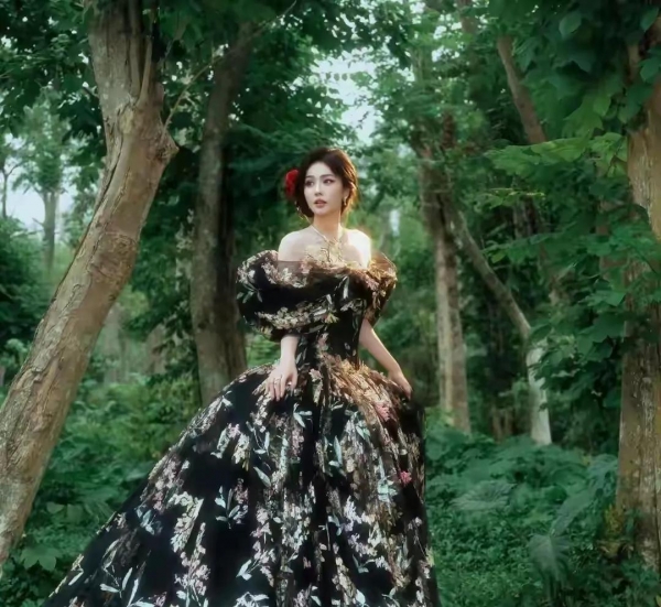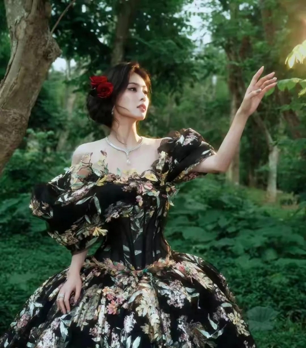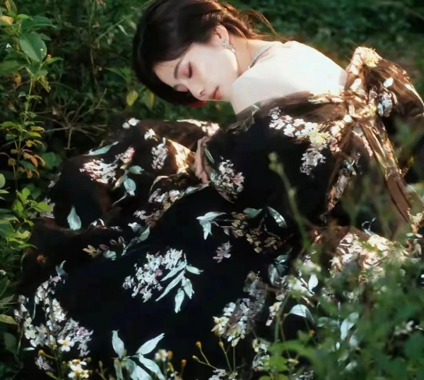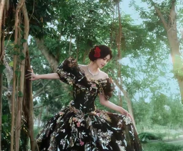 其中第二套黑色纱质蓬裙轻盈又有层次感,上面缀满了粉、白、黄三色立体花卉刺绣,哥特式的神秘基底搭配洛可可式的繁华细节,走在绿意盎然的背景板前,活脱脱就是从古典油画里走出来的森林女神,真的越看越有味道。