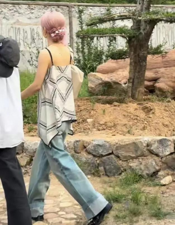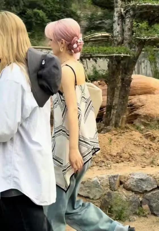 画面中赵丽颖的造型堪称行走的种草机。37°C高温下,她穿着黑色小吊带配高腰阔腿裤,脚踩马丁靴又酷又飒,最绝的是那头樱花粉挑染长发,在阳光下泛着蜜桃色光泽,搭配同色系发带,活脱从《美少女战士》穿越来的火野丽。有游客偷拍时她正弯腰捡垃圾,这个无意间抓拍的动作被做成表情包疯传,粉丝尖叫:"连后脑勺都美得像精修!"