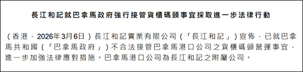 长和表示,巴拿马港口公司已提交行政申诉,要求重新审议导致其港口设施被占用、财产被没收的行政决定。同时,巴拿马港口公司也已依据国际商会(ICC)仲裁规则,对巴拿马政府提起国际仲裁,并已提交补充文件。