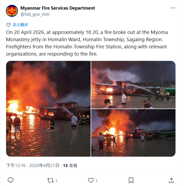 4月21日,缅甸消防部门在社交媒体发布通报称,当地时间4月20日约18时20分,缅甸实皆省一处码头发生火灾。当地消防局消防员及相关部门正在处置火情。