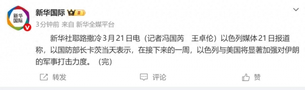 据新华社:以色列媒体21日报道称,以国防部长卡茨当天表示,在接下来的一周,以色列与美国将显著加强对伊朗的军事打击力度。