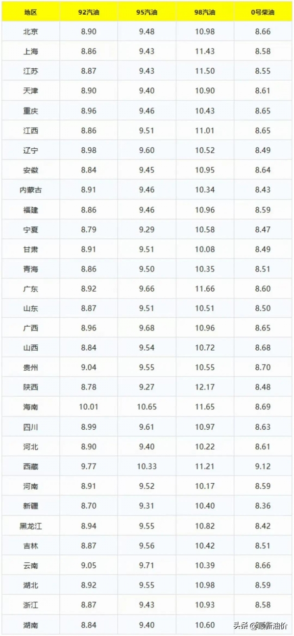 在文章的最后,今日油价最新资讯的小编就带各位车友去看看当前最新油价的报价情况。在油价上涨后,今天来到4月15日,全国各地最新的0号柴油和92、95、98号汽油价格情况(单位元/升):