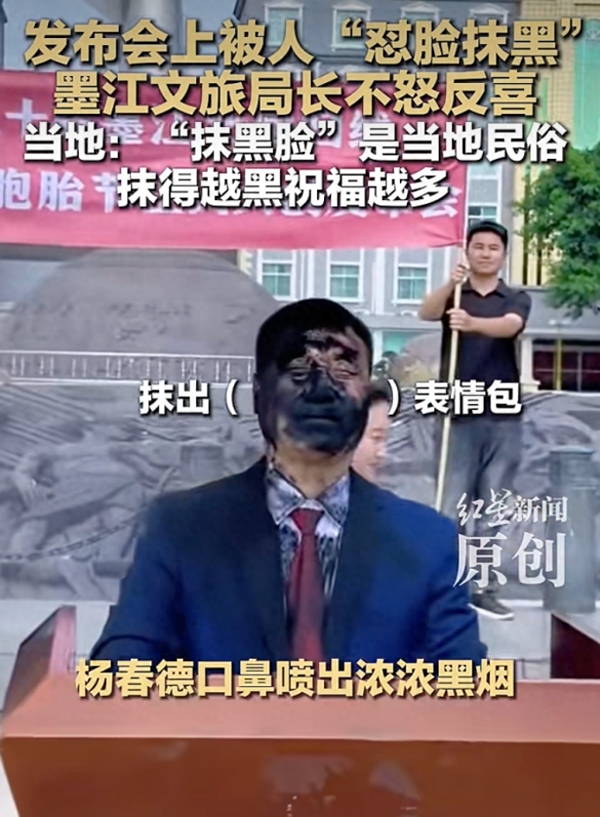 4月1日,云南墨江一发布会现场,文旅局长杨春德讲话时,被几位女士涂了个大黑脸,杨春德口鼻喷出浓浓黑烟,坚持发布完消息后也抹黑对方。