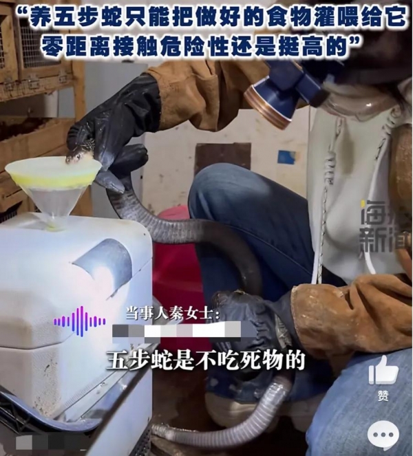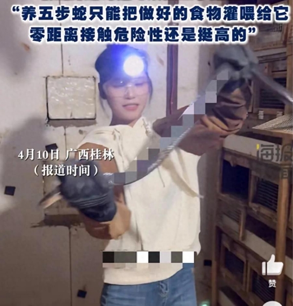 95后女生回村养五步蛇,年入百万 2026-04-10 16:37 今日头条 4月10日,广西桂林,95年出生的秦女士大学毕业两年后回村,帮父亲一起养蛇,年入百万 她说:"五步蛇的蛇干、蛇胆、蛇油都可以入药,取出的蛇毒还可以做医学研究。养五步蛇只能把做好的食物灌喂给它,零距离接触,危险性还是挺高的。"
