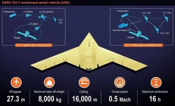 别看它是"无人"的,战斗力可不含糊。机身里藏着能装2吨弹药的弹舱,高超音速导弹、精确制导炸弹都能装,还能跟歼-20组队玩"有人机+无人机"战术--歼-20躲在后方,彩虹-7可前出800公里侦察,相当于把五代机的"感知范围"扩大了3倍。