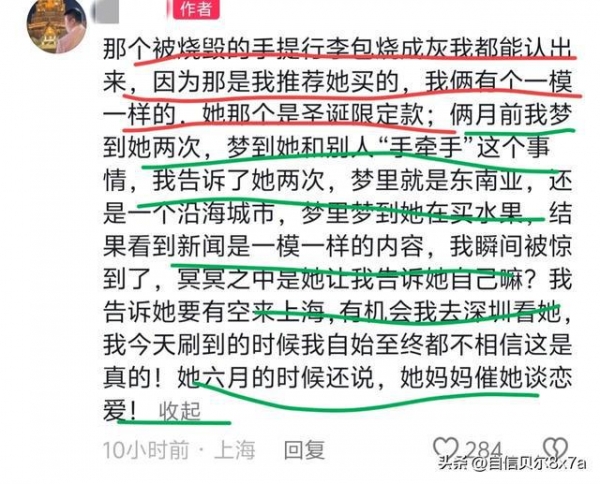 很多人都觉得女子本来是猎手,结果遇到了高端的猎人,以猎物的形式出现,因为女子经常炫富,加上收入不菲。自然有人动了歪心思,两人只认识几天,就去了酒店,对方或者是奔着钱来的,或者说对方也是一个包装的很完美的有钱人,女子真的动情了,结果自己成了猎物。还是说女子遇到了穷途末路的赌徒?