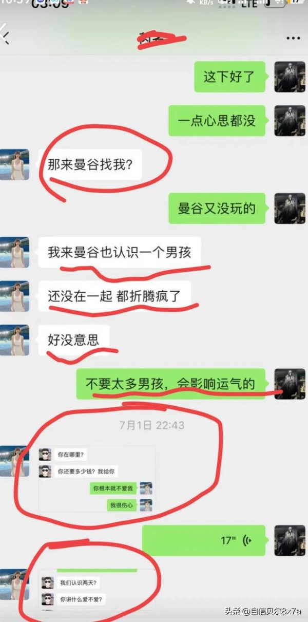 瑞瑞还说在曼谷认识一个男孩,还没在一起就闹腾的不行。还把两人聊天记录发出来了。对方要给女子钱,问女子现在在哪?那么这个男人去给女子钱,还是以给钱的名义见面?
