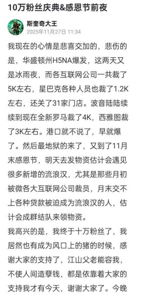 自从"西雅图冰雨夜的万圣节"故事火了之后,俗称"牢A"的在美华人博主"斯奎奇大王"最近收获了很多关注,昨天刚庆祝了自己的十万粉,又讲了一轮感恩节故事。结果讲别的没事,讲到美国日料店绝大多数都是中国人开的时候,被B站封了。