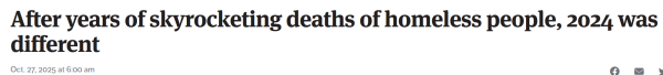 到了今年,《西雅图时报》的标题终于乐观了一点:"无家可归者的死亡数据在多年蹿升之后,2024年终于不一样了":