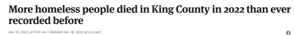 《西雅图时报》(Seattle Times)在2023年的一个报道,标题是"2022年有史以来最多的无家可归者死在了国王郡(西雅图及周边)":
