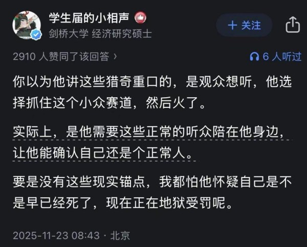 其实更惊悚的"牢A故事会"还有不少,毕竟他在西雅图有一份给医学院收尸的兼职工作,会见识腐烂扭曲的尸体,被帮派虐杀的尸体,还有被吸毒母亲卖掉的小孩尸体……所以大家戏称"牢A"的故事会让人"掉san","牢A"不开播找人说话他自己就会疯掉。