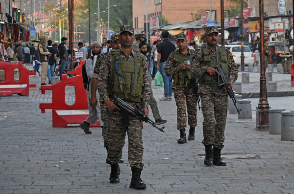 当地时间2025年4月29日,印控克什米尔首都斯利那加,枪击事件发生后,印度士兵加强警戒。 IC photo