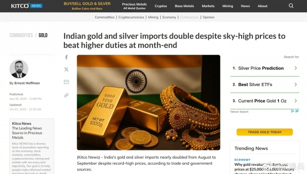 印度黄金白银进口量虽创历史新高,但仍在9月底翻番,以应对关税上调