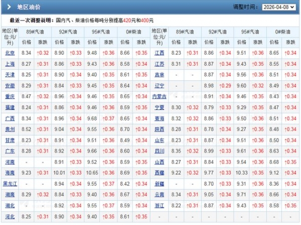 据悉,受本周油价上涨,2026年汽柴油大涨6次后,全年成品油市场呈现"插翅腾飞"的局面,短短3个月时间,国内油价从"6元时代"进入"8元时代",92汽油即将涨至9元/升!数据监控显示,2026年前7次调价,汽柴油"6连涨",汽油累计上涨2740元/吨,折合升价,全国92汽油累计上涨超2.2元/升,95汽油累计上涨超2.35元/升,今年以来,居民加满一箱油,估计多花超110块钱!目前,北京92汽油8.9元/升,95汽油报价9.48元/升,各地汇总报价更新,大家互相查看!