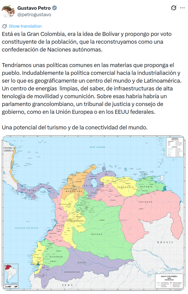 当地时间1月10日,哥伦比亚总统佩特罗在社交平台X发文,提议重建大哥伦比亚共和国。佩特罗写道,"我提议通过全民的制宪投票,将其重建为一个由自治国家组成的邦联。"