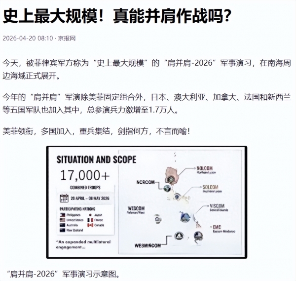 据京报网4月20日发布的报道,当天美菲就要同五国一起在南海周边海域开始"肩并肩-2026"军事演习。除了美菲,日本、澳大利亚、加拿大、新西兰和法国的军队也参与其中,总参演兵力达1.7万人。另外还有17个国家派遣观察员参与。