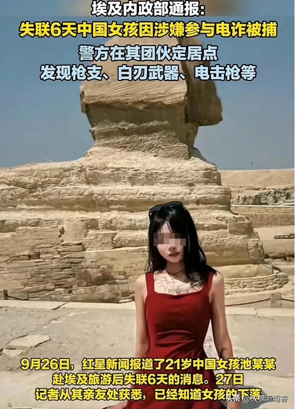 事情始于8月9日。据其亲友透露,池某某怀揣对金字塔的向往与"旅居创业"的憧憬,独自飞往埃及。她向家人描述此行目的:考察当地电商机会,探索文化交融下的新型工作模式。彼时,社交媒体上她发布的照片仍带着青春与自由的气息。然而,自9月22日前后,她的社交账号归于沉寂,电话失联,微信不再回复。闺蜜报警求助,国内媒体迅速跟进。9月26日,"21岁中国女孩埃及失联"登上热搜,舆论场瞬间沸腾--人们担忧她是否遭遇绑架、人口贩卖,甚至更黑暗的命运。