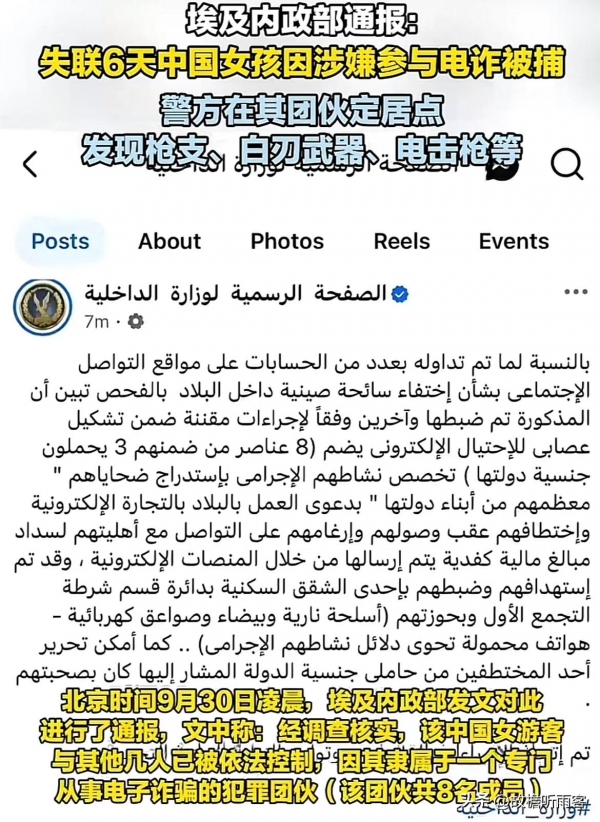 9月30日凌晨,埃及内政部一纸通报,将此前牵动无数国人神经的"21岁中国女孩池某某在埃失联"事件推向了令人震惊的结局--她并非受害者,而是被警方破获的一个跨国电信诈骗团伙成员。这一消息犹如一记重锤,击碎了公众对"少女异国遇险"的温情想象,也揭开了近年来悄然蔓延于北非、中东地区的中国籍犯罪网络冰山一角。