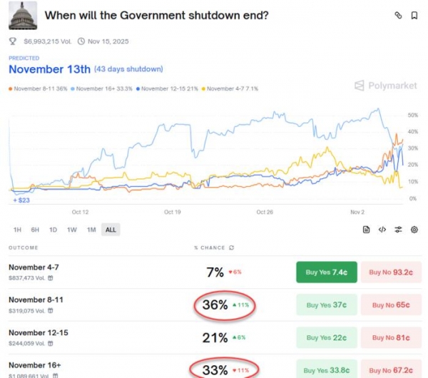 尽管短期前景(根据Polymarket数据,11月11日前结束的可能性仅为36%)仍不明朗,但政治风向的转变和经济代价的累积正在为问题的最终解决创造条件。投资者应密切关注两党领袖会面的进展以及温和派议员所推动的具体解决方案,任何实质性进展都可能迅速提振市场情绪,缓解短期经济下行风险。