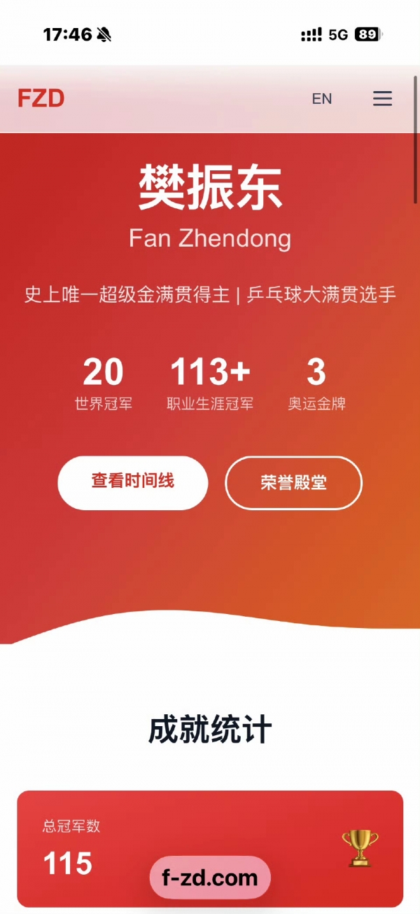 更有球迷为樊振东特意在网络上建立了一个樊振东的网站,网站上有樊振东获得的所有冠军和奖杯奖项等等。向人们展示了这位超级全满贯的含金量。