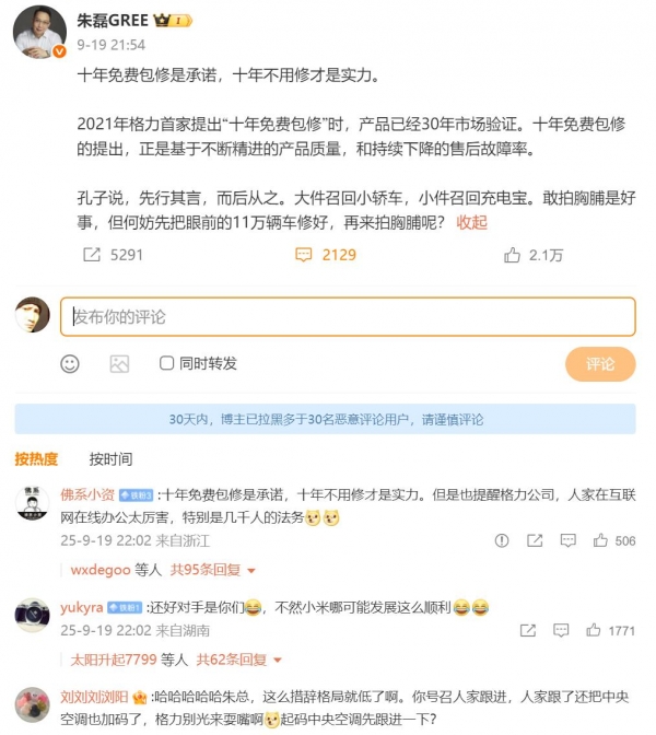 9月,小米宣布空调推出10年免费包修服务,格力高管朱磊发文嘲讽称:"大件召回小轿车,小件召回充电宝,敢拍胸脯是好事。先把眼前的11万辆车修好,再来拍胸脯呢?"或暗指小米此前召回11.6万辆SU7标准版电动汽车。被网友质疑情绪化回应,朱磊还强调"制造业是实干干出来的",批评小米转发"似是而非的信息"。