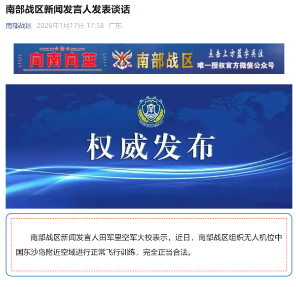 南部战区:组织无人机位中国东沙岛附近空域进行正常飞行训练,完全正当合法 2026-01-17 18:30 观察者网 微信公众号"南部战区"1月17日消息,南部战区新闻发言人田军里空军大校表示,近日,南部战区组织无人机位中国东沙岛附近空域进行正常飞行训练,完全正当合法。