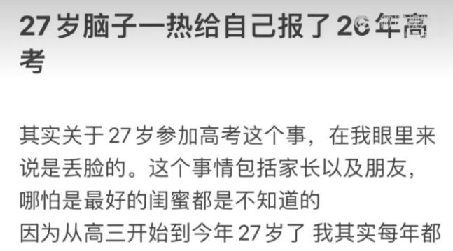 近日,网友发文称:其实关于27岁参加高考这个事,在我眼里来说是丢脸的。这个事情包括家长以及朋友,哪怕是最好的闺蜜都是不知道的。
