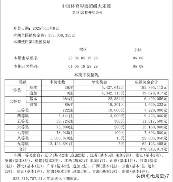 2025年11月8日晚,超级大乐透第25127期开奖,当期3.53亿元销售额迎来罕见派奖高峰。一等奖开出36注基本投注与9注追加,总返奖金额3.79亿元,返奖率突破107%,奖池余额仍高达8.27亿元。