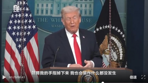 1月20日,特朗普在白宫记者会炫耀一年"政绩"时手指差点被夹,疑似拿夹子和文件撒气。