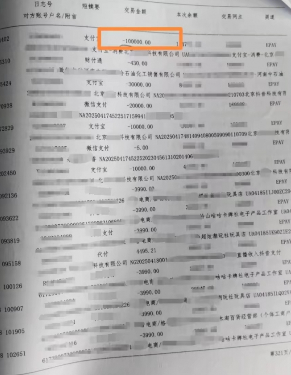 转折点发生在2024年7月。那之前,小梦的网上消费单笔只有几十到一千元。7月17日开始,消费频率突然飙升--7月24日消费33笔,累计37278元;7月25日32笔,累计23265元;7月26日37笔,累计24117元。她大多从早上八九点开始,一直刷到晚上十一二点,偶尔凌晨一两点还在花钱。2024年下半年开始,单笔消费超过1万元的次数越来越多,多次出现单笔3万、4万、5万元的大额消费。2025年3月到4月,多次单日消费超过16万元。4月17日当天,单笔最大打赏达10万元,当日累计消费14.64万元。