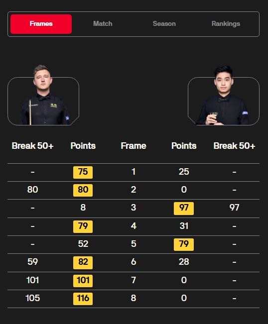 全场比赛,凯伦·威尔逊打出两杆破百(101、105)和两杆50+(80、59),斯佳辉在第三局打出单杆97分。